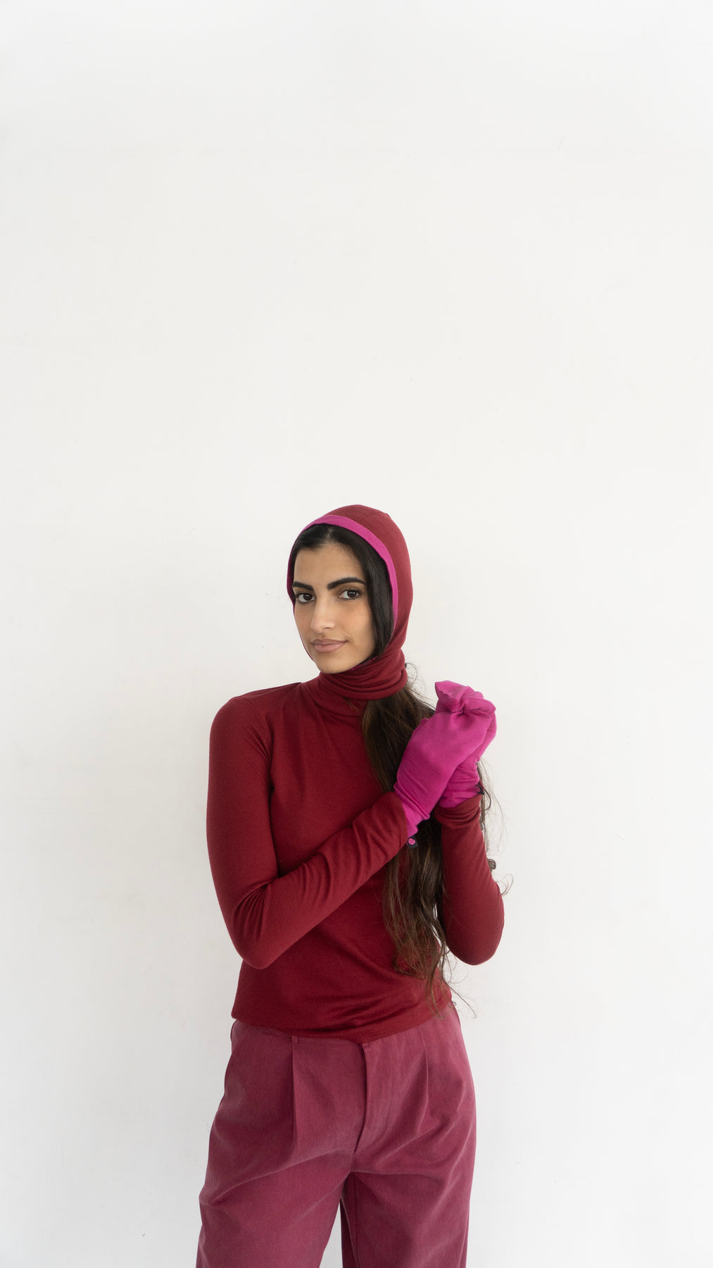 Very cute and practical layering balaclava. Made from 100% Merino Wool, so you can stay cute and warm all winter. Perfect layered under a hat on cold days, or worn on it's own for working out in the winter. This item is sewn by Rose and has a 1 week wait period.