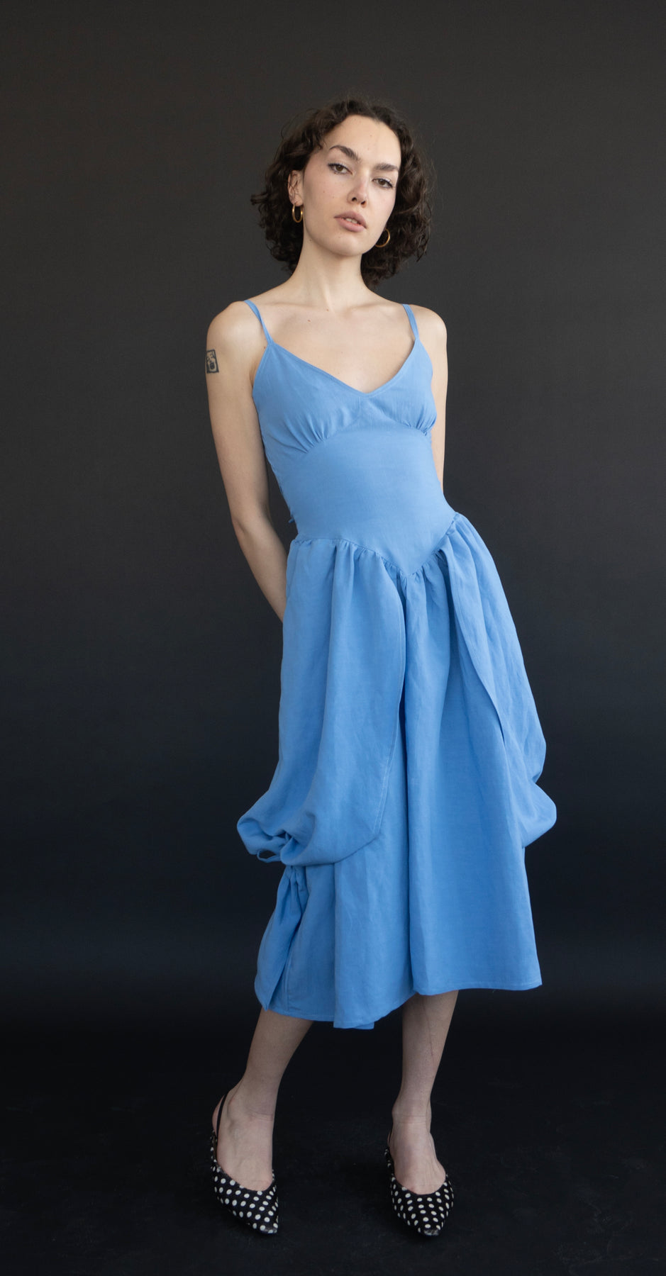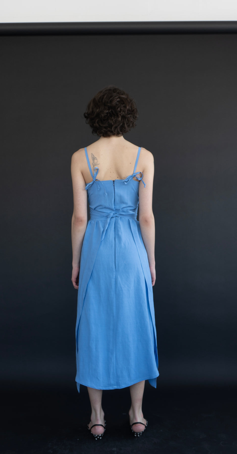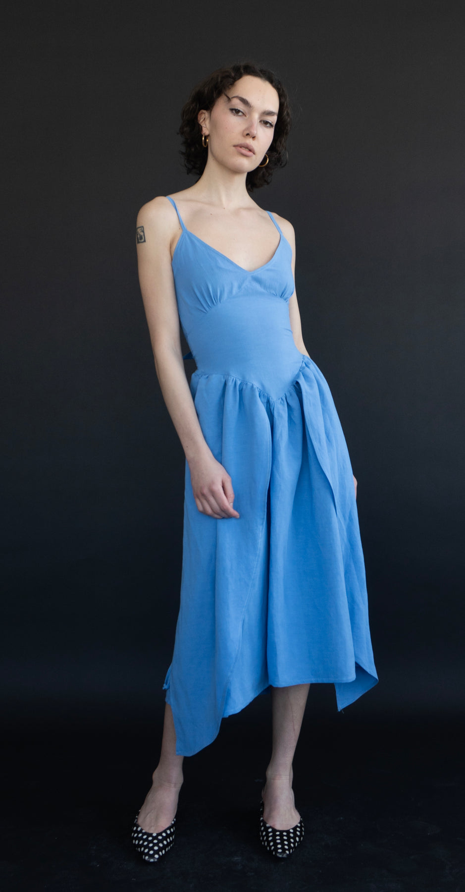 This dress is from Rose McMahon's inner most romantic dreams! It is the same cut and fit as the Magdala dress, but with two side gussets that tie at the side seam. The dress still features two side pockets, and adjustable straps. It's beautiful!