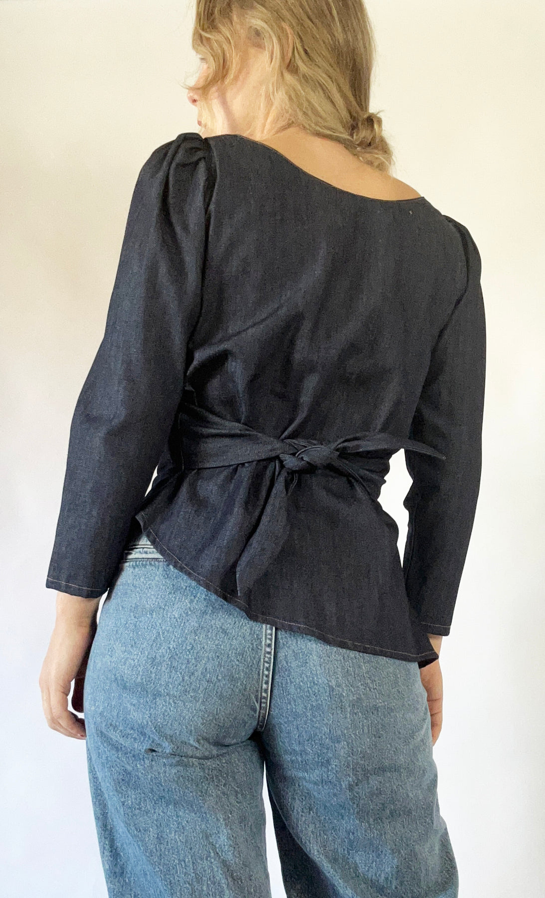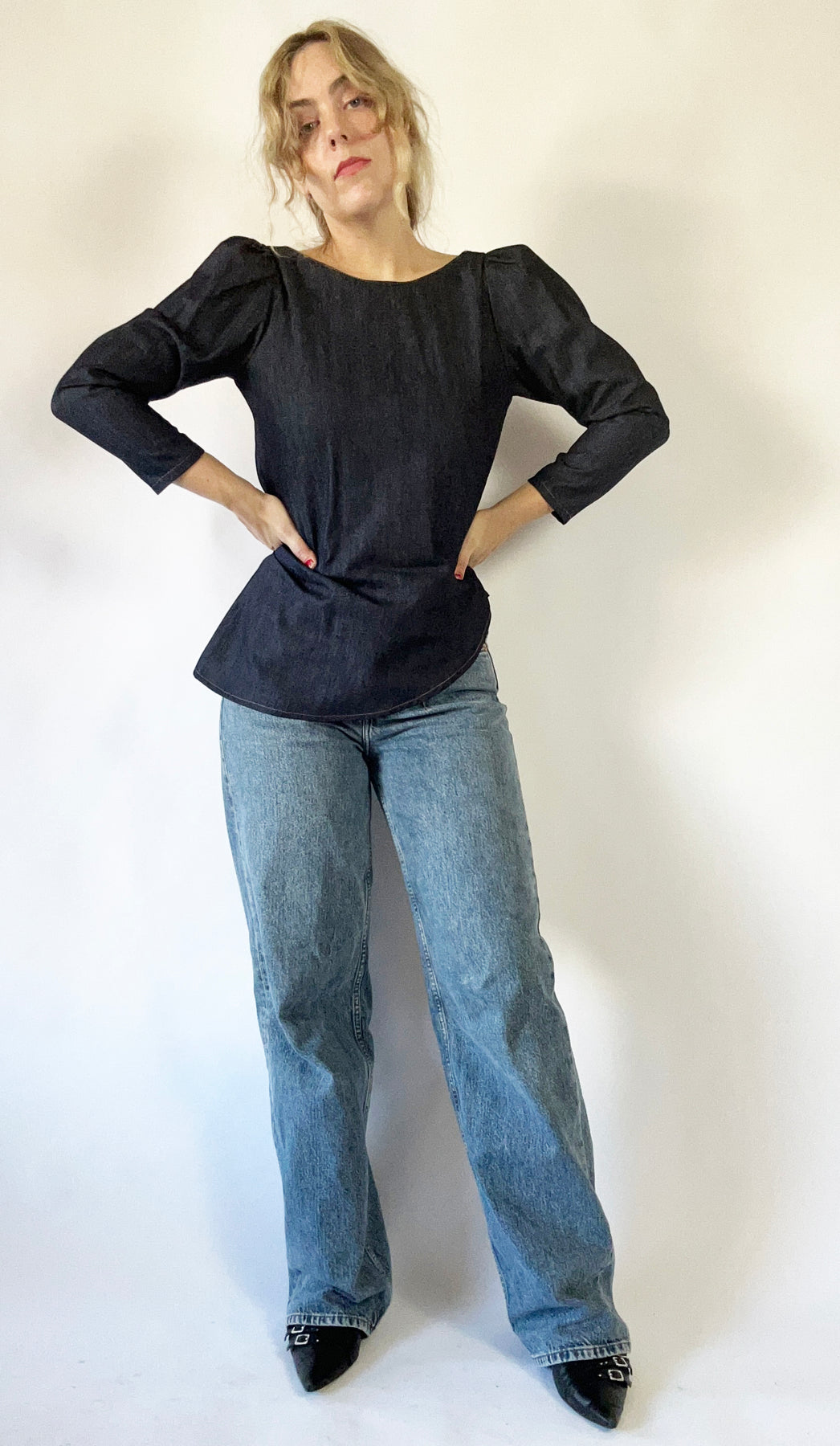 Perfect Clara Blouse in indigo denim. Features a pleated shoulder, with a puff sleeve and ties in the back. Only one available.