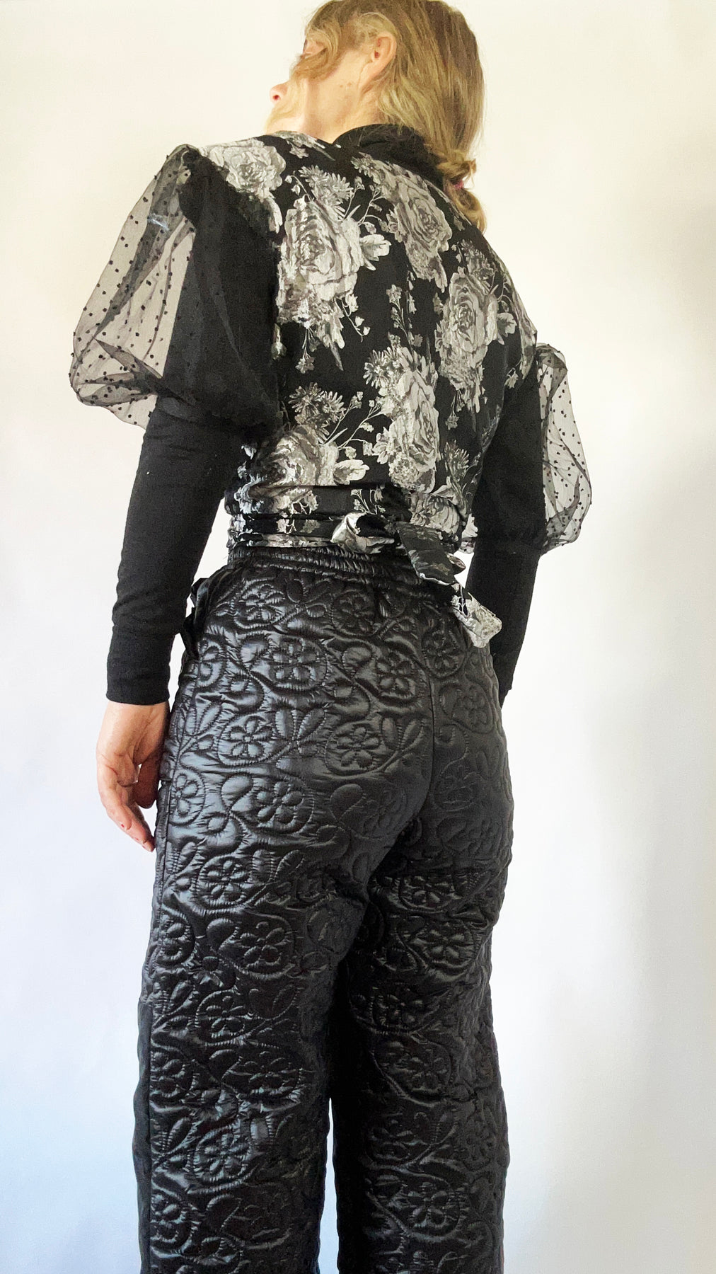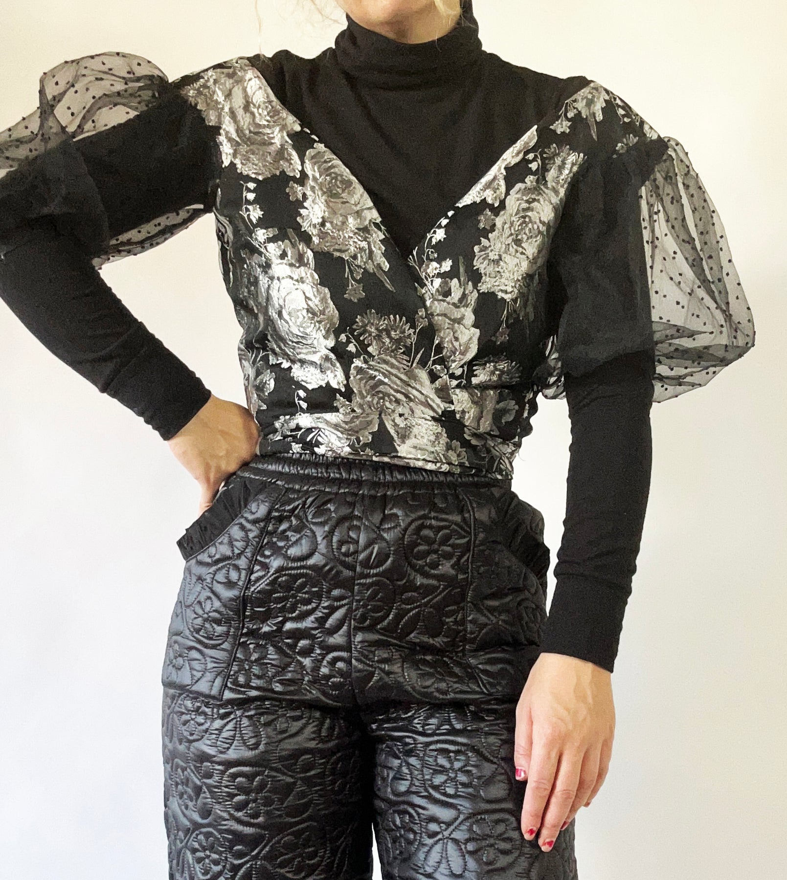Brocade wrap top that ties in the back. Featuring swiss dot organza puffed sleeves. Off the shoulder silhouette. Fits best a size xs or small